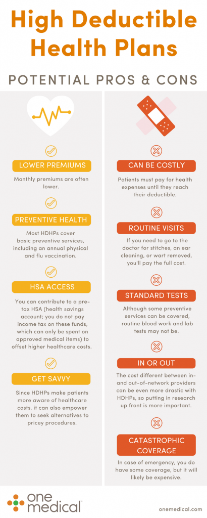 Other services will likely come at a higher cost since since you have a heftier deductible to meet. If your plan’s deductible is over $1,300 (single coverage) or $2,600 (family coverage), it is considered a high-deductible health plan (HDHP).